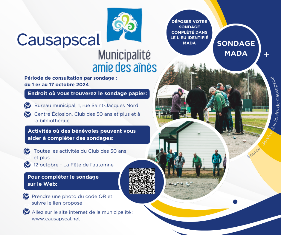 La municipalité de Causapscal est reconnu Municipalité Amie Des Ainés (MADA) depuis 2012. Le comité de pilotage souhaite recuillir le plus d'information possible sur vos besoins.